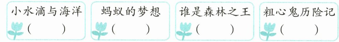 $\begin{array}{c} \boxed{\begin{array}{c} 小水滴与海洋 \\ (\quad) \end{array} } \\ \downarrow \\ \boxed{\begin{array}{c} 蚂蚁的梦想 \\ (\quad) \end{array} } \\ \downarrow \\ \boxed{\begin{array}{c} 谁是森林之王 \\ (\quad) \end{array} } \\ \downarrow \\ \boxed{\begin{array}{c} 粗心鬼历险记 \\ (\quad) \end{array} } \end{array}$
