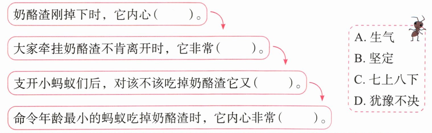 五、联系课文内容,蚂蚁队长的心理发生了怎样的变化?选一选。(目标:403)