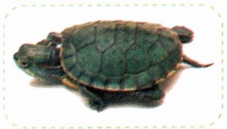 巴西龟的背甲是绿色的,上面有黑色的花纹,像一块小小的盾牌。它的四肢短短的,爪子尖尖的,还有一条小小的尾巴。