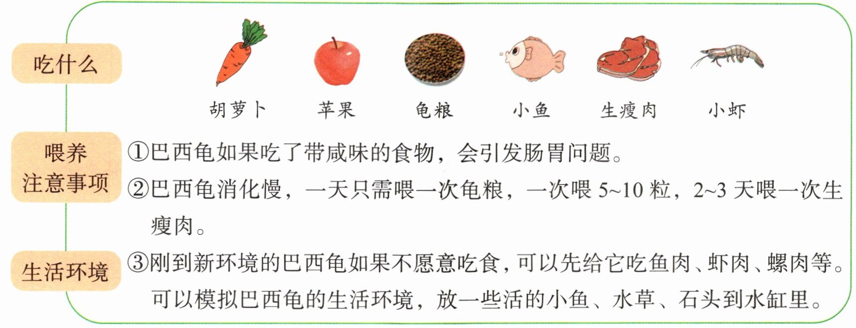 (2)奇奇担心巴西龟不愿意吃食,所以每天喂它生瘦肉。(×)