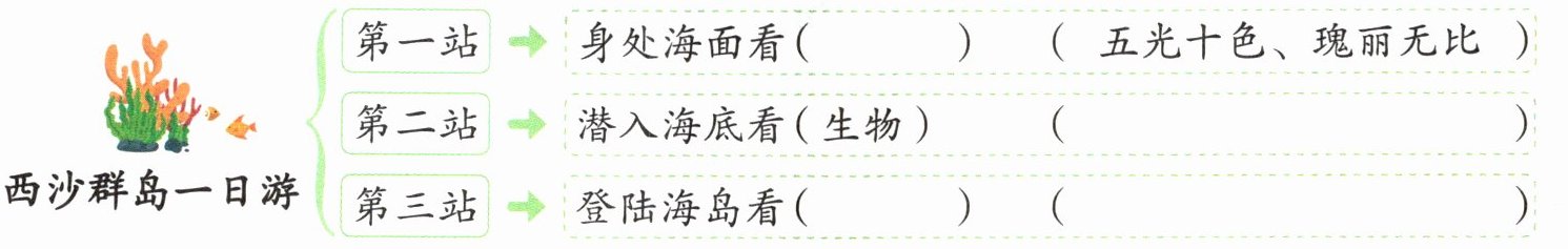 六、思维题 请你根据课文内容安排西沙群岛一日游行程,照样子补充行程图。(目标:603)