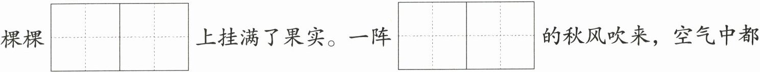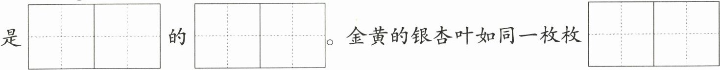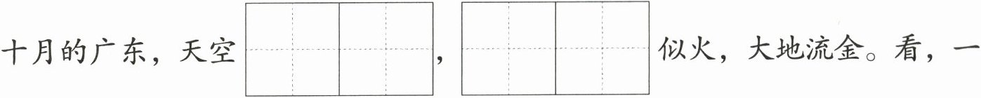 十月的广东,天空$\begin{array}{|c|c|}\hline míng & lǎng \\\hline\end{array}\\\hline $,$\begin{array}{|c|c|}\hline fēng & yè \\\hline\end{array}\\\hline $似火,大地流金。看,一棵棵$\begin{array}{|c|c|}\hline guǒ & shù \\\hline\end{array}\\\hline $上挂满了果实。一阵$\begin{array}{|c|c|}\hline liáng & shuǎng \\\hline\end{array}\\\hline $的秋风吹来,空气中都是$\begin{array}{|c|c|}\hline xiāng & tián \\\hline\end{array}\\\hline 的\begin{array}{|c|c|}\hline qì & wèi \\\hline\end{array}\\\hline $。金黄的银杏叶如同一枚枚$\begin{array}{|c|c|}\hline yóu & piào \\\hline\end{array}\\\hline $,带来了秋天的消息。一块块稻田整齐地$\begin{array}{|c|c|}\hline pái & liè \\\hline\end{array}\\\hline $着,就像$\begin{array}{|c|c|}\hline jīn & sè \\\hline\end{array}\\\hline $的海洋。秋雨中,一朵朵菊花在向我们