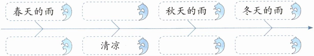 2. 读第②自然段,用“____”画出这段话的关键句。我知道春雨落在了屋顶、______、______,颜色也分别发生了变化:瓦蓝、______、______。