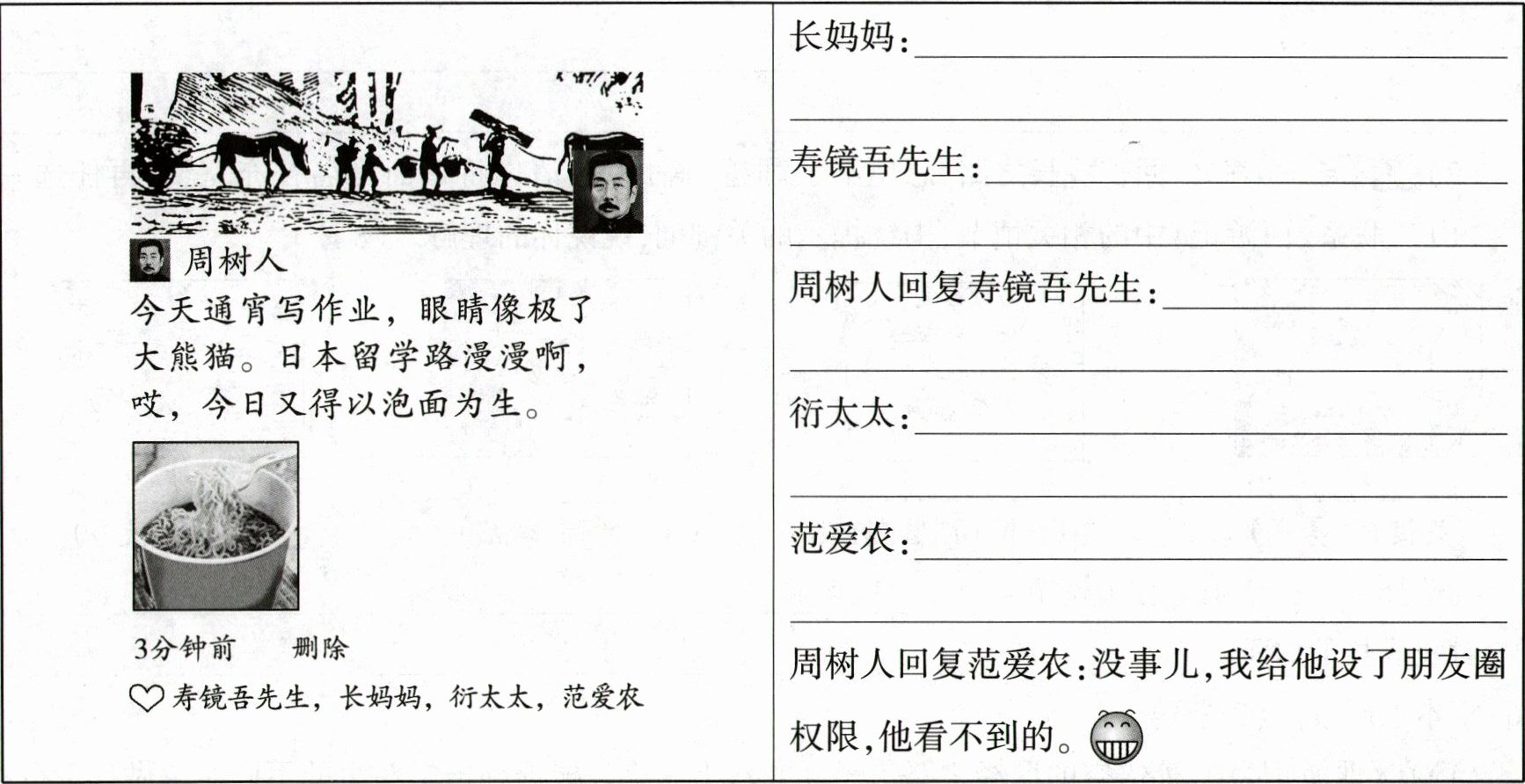 (1)小语读完《朝花夕拾》后,设计了如下图鲁迅先生的朋友圈。请你根据《朝花夕拾》的整本书阅读,任意选择两位人物完成评论。(4分)