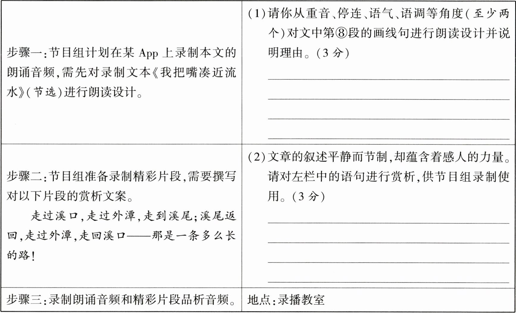 实验中学的校广播台推出新节目“文声兼美”,这是由一篇文字、一份欣赏、一段音乐、一种声音组成的文学节目。本期分享的是《我把嘴凑近流水》(节选),请你跟同学们一起完成节目制作吧!(13 分)