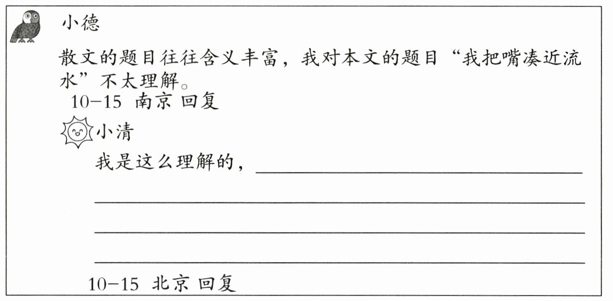 16. 节目组设置了“每期一问”栏目,小德对散文的标题不太理解,请你帮助小清回复。(4 分)