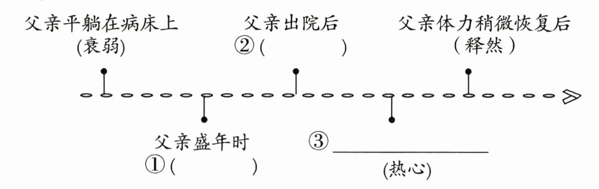 14.①硬朗 ②软弱(或衰弱、伤感、恐惧) ③父亲退休前(3分,每空1分) 【解析】本题考查文章内容的理解与概括。①结合第⑤段“父亲在盛年时候,面容硬朗,像版画里棱角分明的鲁迅”及题干已知项“衰弱”“热心”可知,此处可填:硬朗;②结合第⑦段“颉,我软弱呀!冇力气”和第⑧段“竟然伤感”“有了一丝丝衰弱的恐惧与战栗”可得:软弱(或衰弱、伤感、恐惧);③结合第⑨段“父亲退休前是一个小学校长”和“父亲当年‘打路走’,挨家挨户去家访,免费辅导学生功课,助他们考上大学”可得:父亲退休前。