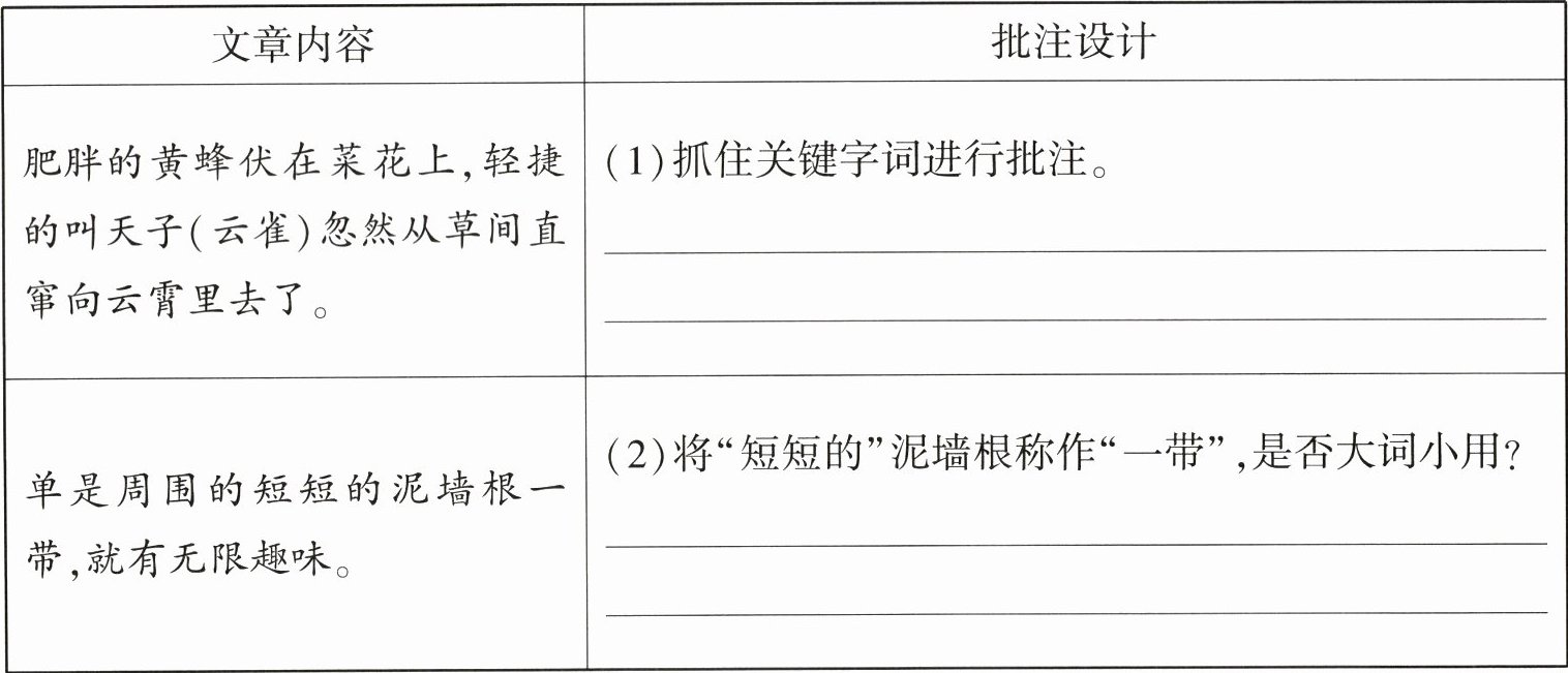 (2)用“一带”这个大词来修饰“短短的”泥墙根,强调了其在作者心中的重要性和特殊情感。大词小用为读者提供了广阔的想象空间,让简单的场景变得富有深意和层次。(2分)