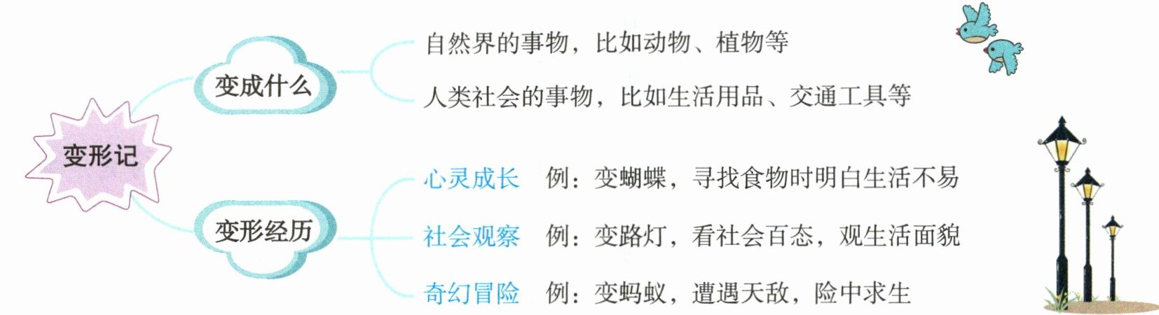 选定变形之物:路灯;如何引出:夜晚路过街角,望着亮着的路灯出神,忽然身体变沉,双脚生根,我成了那盏路灯。我的标题:《我是街角的一盏路灯》。变形后的经历略写:刚变路灯时,身体被水泥固定,头顶灯泡亮起,看见晚风吹动树叶。详写:深夜,背书包的女孩借灯光背书,清洁工阿姨扫落叶擦汗,老夫妻搀扶散步,爷爷给奶奶披衣。结局和收获:天亮阳光照来,我变回自己;感受:每盏路灯下都有故事,平凡陪伴也能温暖人心,生活处处有真情。