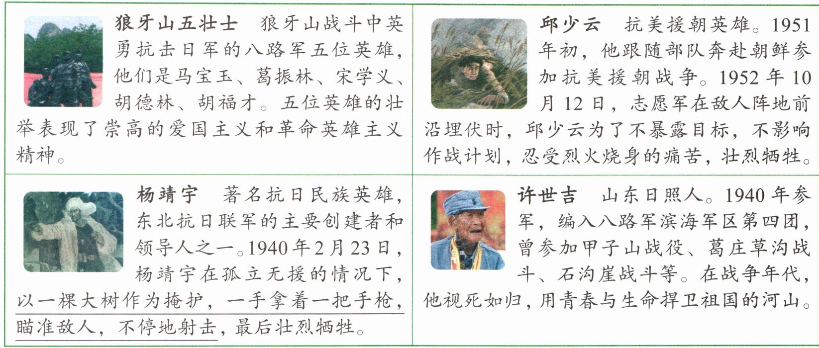 1.B 解析:本题考查根据历史知识进行判断的能力。狼牙山五壮士是在抗日战争时期英勇抗击日军的群体英雄;杨靖宇是著名的抗日民族英雄;许世吉是抗日战争时期的八路军战士;而邱少云是抗美援朝战争中的英雄,与其他几位所处的战争时期不同,所以邱少云需要单独展示,答案选B。
