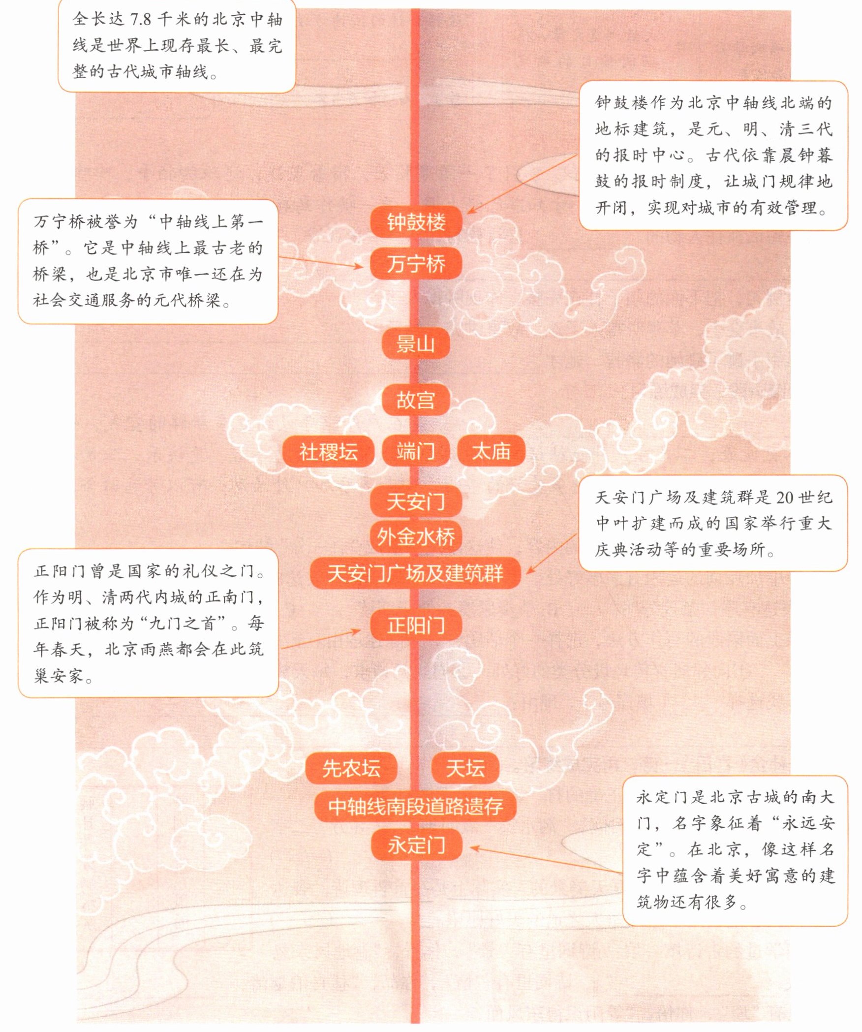 ①北京中轴线全长达7.8千米,是世界上现存最长的古代城市轴线。