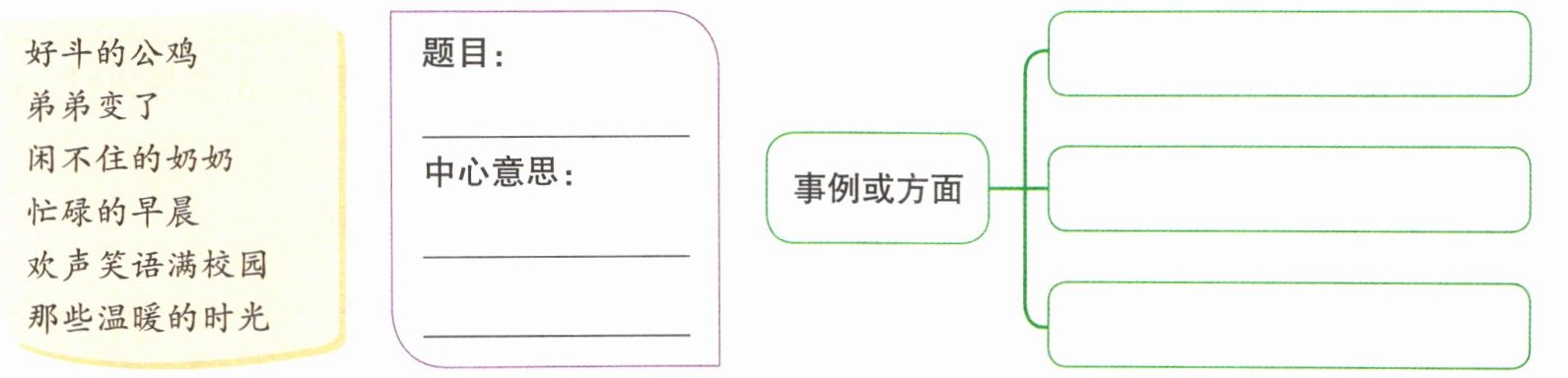 (示例)题目:闲不住的奶奶 中心意思:奶奶是一个闲不住的人 事例或方面:每天为家人准备三餐,且不重样 天天打扫卫生,家里总是很整洁 一有空就参加社区组织的志愿服务 每天为家人准备三餐,且不重样