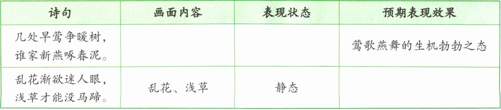 |几处早莺争暖树,谁家新燕啄春泥。| | |莺歌燕舞的生机勃勃之态|