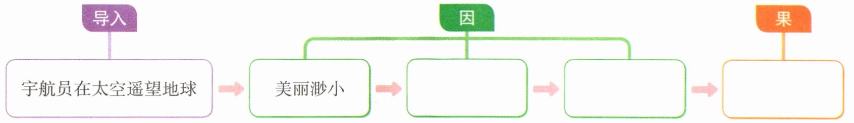 资源有限 无法移居 保护地球 解析:本题主要考查整体把握课文内容的能力。课文先从宇航员在太空遥望地球所看到的景象导入,接着从地球的美丽与渺小谈起,然后指出自然资源有限,而人类又无法移居其他星球,使人们认识到“只有一个地球”,保护地球不仅重要,而且必要,激发人们保护地球的情感,由此层层递进、水到渠成地得出“保护地球”这个结论。