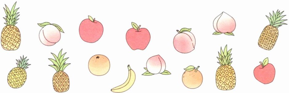 (2)菠萝有5个,苹果有3个,橘子有2个,桃子有4个,香蕉有1个,5>4>3>2>1,所以菠萝的数量最多,香蕉的数量最少。