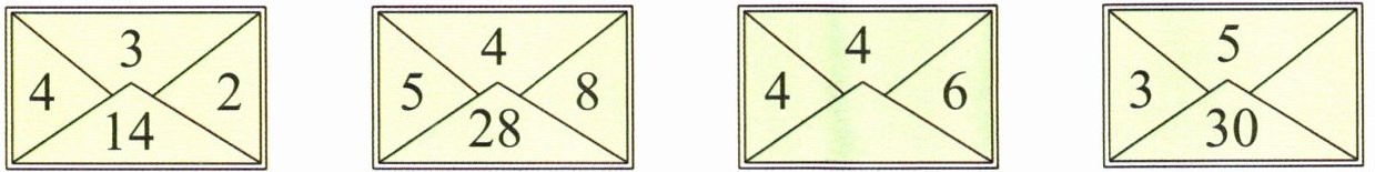 22 15 解析:先找出规律,再填数。通过观察发现,信封上左面的数乘上面的数再加右面的数等于下面的数。如下圈所示: