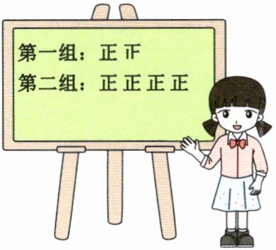 (2)同理,第二组呈现的是4个“正”字,所以算式中的“5”和“4”表示的是有这样的4个5分,所以此题解决的问题是第二组得了多少分。
