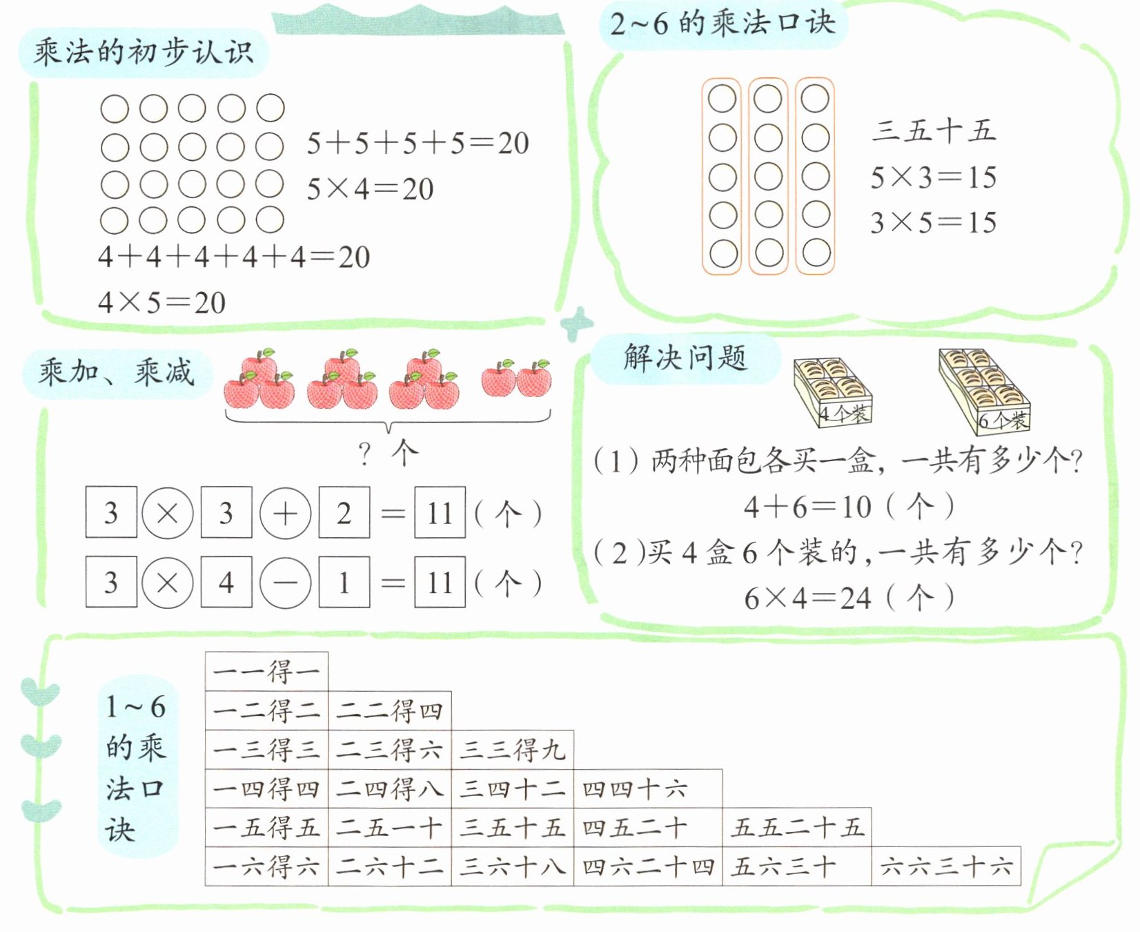 (2)买4盒6个装的,求一共有多少个,就是求4个6是多少,用乘法计算。