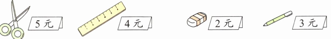 (1)5×4=20(元) (2)买3支笔一共要多少钱? 3×3=9(元)(答案不唯一) 解析:(1)一把剪刀5元,求买4把剪刀一共需要多少钱,就是求4个5元是多少元,用乘法计算。(2)由题图可知,1把剪刀5元,1把尺子4元,1块橡皮2元,1支笔3元,可以提出许多用乘法解决的问题,如买3支笔一共要多少钱?买6块橡皮一共要多少钱?答案不唯一。