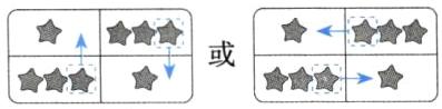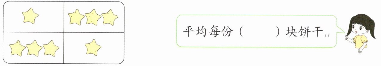 解析:要使每份饼干同样多,可以用“移多补少”的方法(如上图),从有3块饼干的那一份中移1块到只有1块的那一份,3-1=1+1,使每份都有2块饼干。