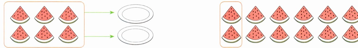 解析:由题图可知,左图把6块西瓜平均分在2个盘子里,每个盘子放(6÷2)块,故连第4个算式;右图有12块西瓜,每2块分一份,可以分成(12÷2)份,故连第2个算式。