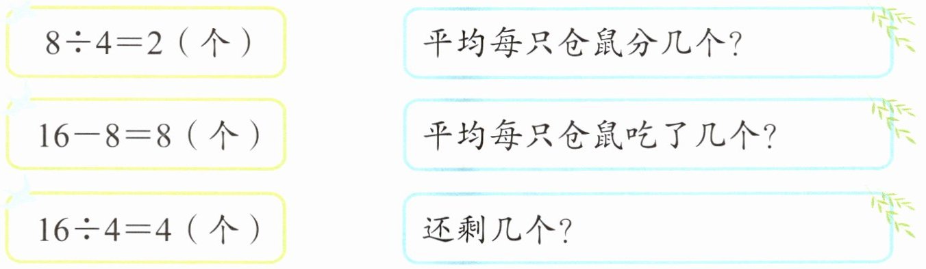 解析:要求平均每只仓鼠分几个,就是把16个蓝莓平均分成4份,求每份是多少,用除法计算,列式为16÷4=4(个);要求平均每只仓鼠吃了几个,就是把8个蓝莓平均分成4份,求每份是多少,用除法计算,列式为8÷4=2(个);要求还剩几个,就是从16个里面去掉吃了的8个,用减法计算,列式为16 - 8=8(个)。