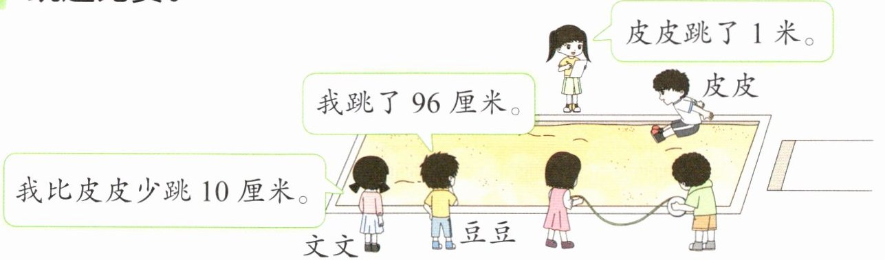 5.皮皮 解析:根据题意可知,皮皮跳了1米,1米=100厘米,即皮皮跳了100厘米,豆豆跳了96厘米,文文比皮皮少跳10厘米,即文文跳了100-10=90(厘米)。因为100>96>90,所以皮皮跳得最远。