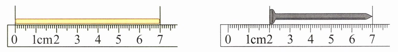 7 5 解析:用尺子测量物体的长度,如果尺子的刻度0对准物体的左端,看物体的右端对着刻度几,物体的长度就是几厘米;如果尺子的左端从中间刻度起,用后面刻度减前面刻度算出长度。尺子的刻度0对准木棒的左端,木棒的右端对着刻度7,即木棒长7厘米;钉子从刻度2到刻度7的长度是7-2=5(厘米)。