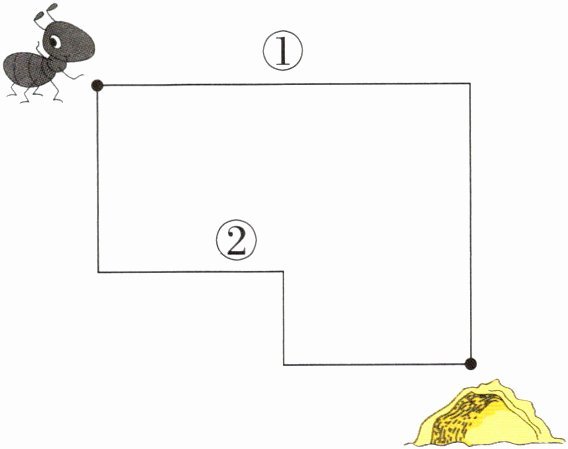 4. (1)量一量,蚂蚁从第①条路爬( )厘米就回到家了。