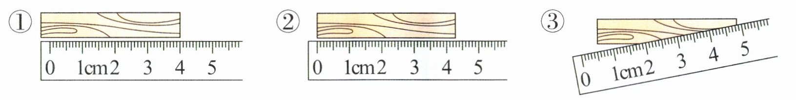 解析:选项①,木块的左端没有与刻度0对准,而是与尺子的左端对准,导致测量结果不准确,测量方法错误。选项②,木块的左端对准刻度0,右端对准刻度4过一点,木块大约长4厘米,测量方法正确。选项③,尺子既没有放平,又没有与刻度0对准,测量方法错误。