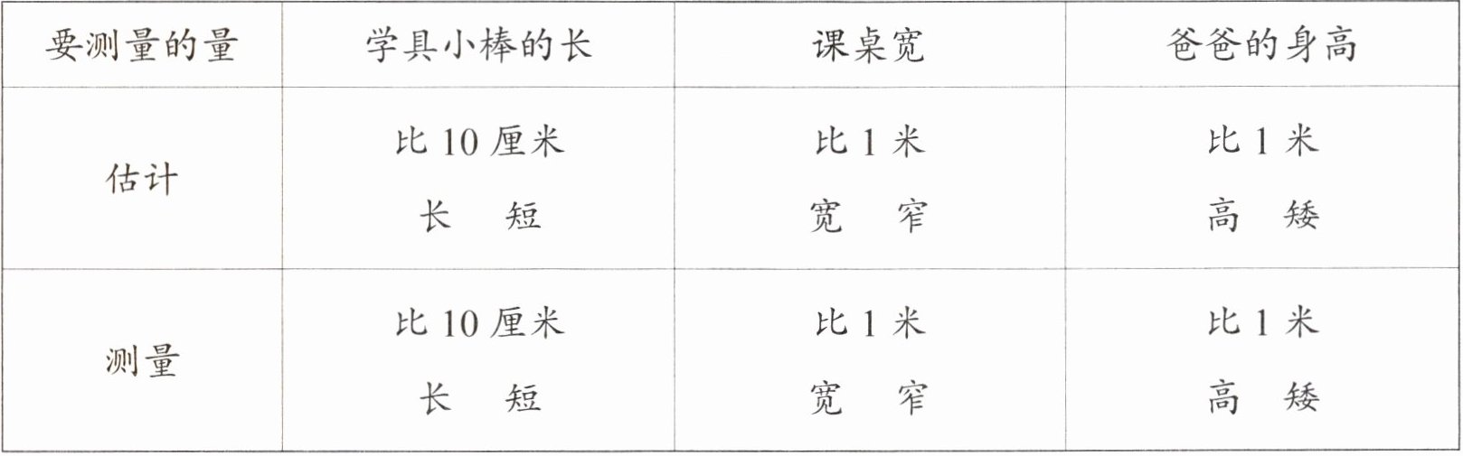 |要测量的量|学具小棒的长|课桌宽|爸爸的身高|