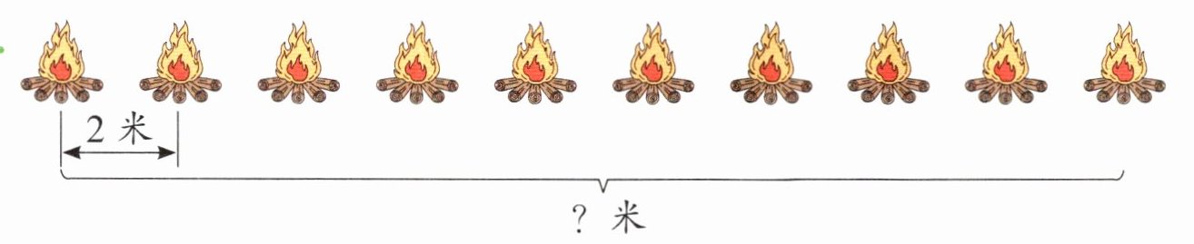 2.2×9=18(米)解析:每相邻两堆篝火相距2米,也就是每个间隔是2米。第1堆篝火与第10堆篝火之间有9个间隔,求9个间隔长多少米,就是求9个2米是多少米,用乘法计算。
