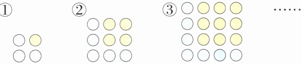 6.64 17 解析:观察题图,黄珠子从第一堆开始计数,有1行,有1颗,有1×1=1(颗);第二堆的黄珠子有2行,每行2颗,有2×2=4(颗);第三堆的黄珠子有3行,每行3颗,有3×3=9(颗)。根据规律,第8堆一共摆黄珠子8×8=64(颗)。蓝珠子从第1堆开始计数,圈一圈后(如下图)可以发现,前3堆蓝珠子颗数依次是1×2+1、2×2+1、3×2+1……那么第8堆一共要摆蓝珠子8×2+1=17(颗)。还可以找到珠子总颗数的规律,用总颗数减去黄珠子的颗数,剩下的就是蓝珠子的颗数。
