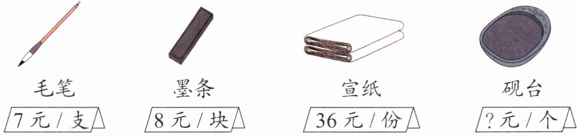 解析:根据题图可知,一支毛笔7元,一块墨条8元,一份宣纸36元,可以提出许多不同的数学问题,如买5支毛笔一共需要多少钱,40元可以买几块墨条等,根据提出的问题列式解答即可。