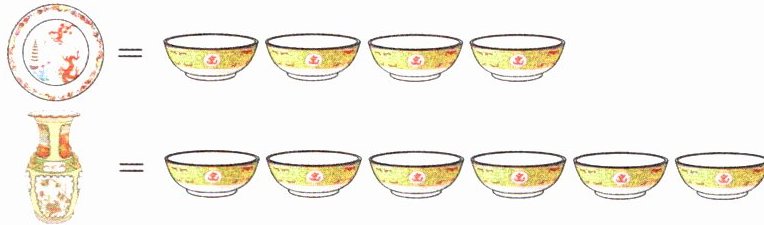 7. 碗、盘子、花瓶的价格关系如图所示,有一笔钱正好能买9个盘子。如果用这笔钱买碗,可以买几个?买花瓶呢?