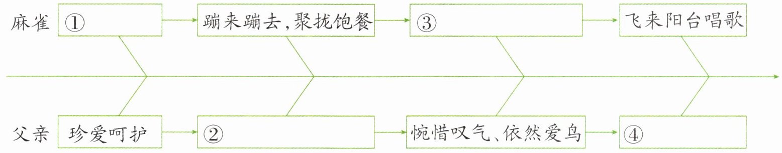 2. 文章着重记叙了父亲与麻雀之间发生的故事,请你梳理情节,补全下面的思维导图。