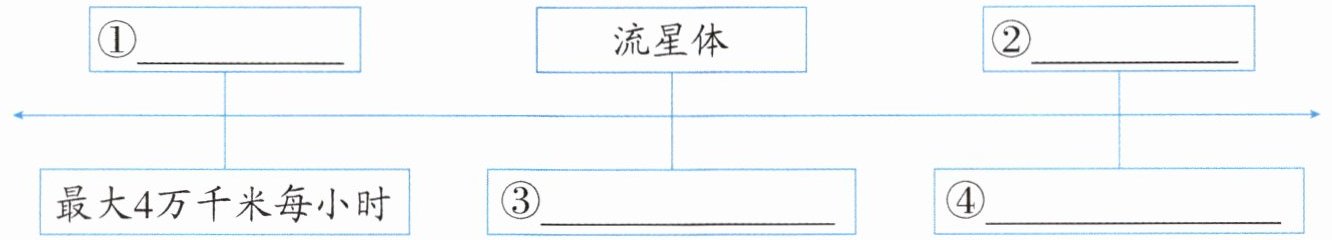 ①看!前面呼啸而过的东西是什么?跟它的速度一比,火箭就好像是静止的一样。那是流星体!流星体是太空中一种较小的天体。有的流星体运动的最大速度能达到 25 万千米每小时,是火箭运动最大速度的 6 倍多。