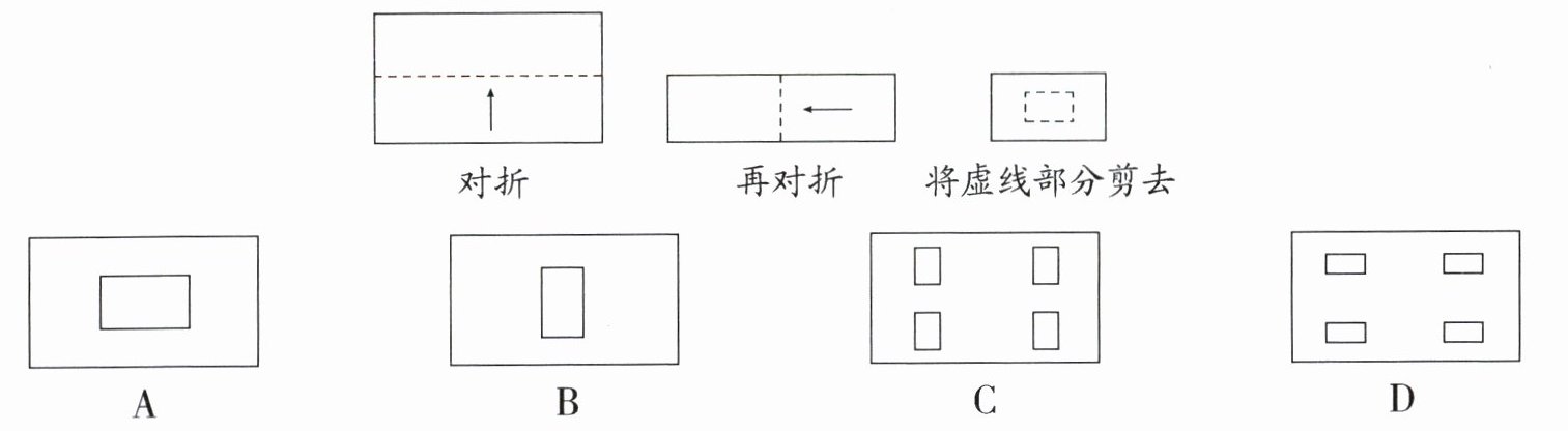 D [解析]如图,将一张长方形纸对折,再对折,然后沿图中虚线剪下扔掉,剩下的图形展开后可得到图形