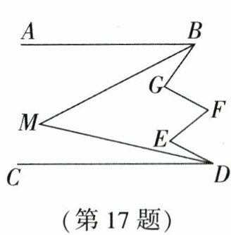 17. 如图,$ AB // CD $,$ \angle ABC $ 的平分线与 $ \angle CDE $ 的平分线交于点 $ M $,$ \angle M = 45^{\circ} $,$ \angle F = 64^{\circ} $,$ \angle E = 66^{\circ} $,则 $ \angle G = $