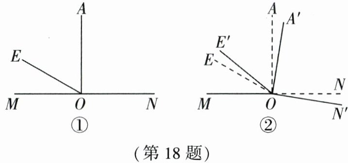 18. 如图①,点 $ O $ 是直线 $ MN $ 上一点,过点 $ O $ 作射线 $ OE $,使 $ \angle EOM = \frac{1}{5} \angle EON $,过点 $ O $ 作射线 $ OA $,使 $ \angle AOM = 90^{\circ} $.如图②,$ \angle EON $ 绕点 $ O $ 以每秒 $ 9^{\circ} $ 的速度顺时针旋转得 $ \angle E'ON' $,同时射线 $ OA $ 绕点 $ O $ 以每秒 $ 3^{\circ} $ 的速度顺时针旋转得射线 $ OA' $,当射线 $ OA' $ 落在 $ OA $ 的反向延长线上时,射线 $ OA' $ 和 $ \angle E'ON' $ 同时停止,在整个运动过程中,当 $ t = $