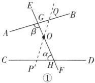 (2)①因为∠β=∠α+20°,∠DHG=180°−∠α,∠BGH=180°−∠β,所以∠DHG−∠BGH=∠β−∠α=20°,所以∠DHG=∠BGH+20°.又因为∠DHG与∠BGH是同旁内角,所以∠DHG是∠BGH的内联角. ②∠EOP是∠CPO的内联角时,∠EOP=130°;∠EOP是∠DPO的内联角时,∠EOP=160°. [解析]点P在点H左侧如图①所示,此时有两种情况,当∠EOP是∠AGH的内联角时,∠EOP=∠β+20°=∠α+20°+20°=100°,此时PQ//AB,不符合题意;当∠EOP是∠CPO的内联角时,∠EOP=∠CPO+20°=60°+180°−∠EOP+20°=260°−∠EOP,解得∠EOP=130°;
