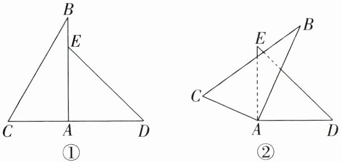 (2)成立,理由如下,设三角板ABC绕点A顺时针旋转α(0°≤α≤360°),情况1,当0°≤α≤180°时,如图②,∠BAE=α,∠CAD=∠BAC+∠DAE−∠BAE.因为∠BAC=∠DAE=90°,所以∠CAD=90°+90°−α=180°−α,所以∠BAE+∠CAD=α+(180°−α)=180°.情况2,当180°<α≤360°时,如图③,∠BAE+∠CAD=360°−∠BAC−∠DAE=360°−90°−90°=180°;所以
