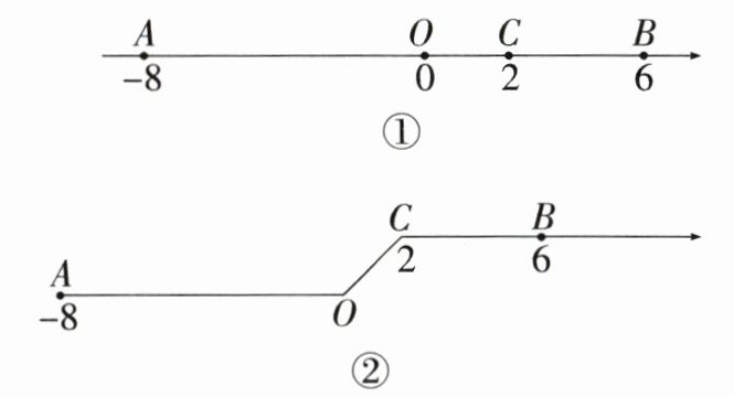 (2)如图②,我们将图①的数轴沿点O和点C各折一次后会得到一个新的图形,与原来相比,线段AO和CB仍然水平,线段OC处产生了一个坡度,我们称这样的数轴为“坡数轴”,其中O为“坡数轴”的原点,在“坡数轴”上,每个点对应的数就是把“坡数轴”拉直后对应的数.记“坡数轴”上点A到点B的距离$\overline {AB}$为A和B拉直后的距离,即$\overline {AB}= AO+OC+CB$,其中AO,OC,CB代表线段长度.在“坡数轴”上,上坡时点的移动速度变为水平路线上移动速度的一半,下坡时移动速度变为水平路线上移动速度的2倍.