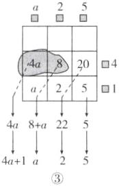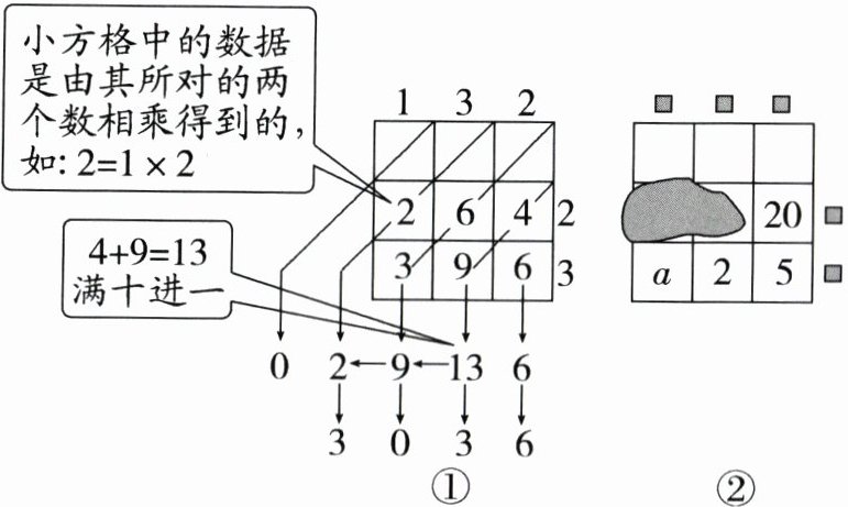 1. (2024·河北中考)“铺地锦”是我国古代一种乘法运算方法,可将多位数乘法运算转化为一位数乘法和简单的加法运算.淇淇受其启发,设计了如图①所示的“表格算法”,图①表示$132×23$,运算结果为3036.图②表示一个三位数与一个两位数相乘,表格中部分数据被墨迹覆盖,根据图②中现有数据进行推断,正确的是 ( )