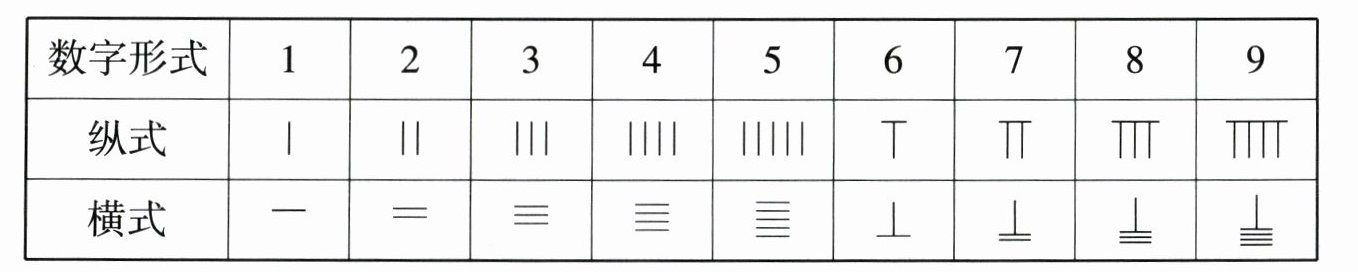 表示多位数时,个位用纵式,十位用横式,百位用纵式,千位用横式,以此类推,遇零则置空.示例