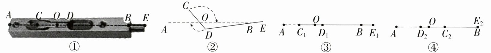 18. (2024·盐城大丰区期末)如图①,一款暗插销由外壳AB、开关CD、锁芯DE三部分组成,其工作原理如图②,开关CD绕固定点O转动,由连接点D带动锁芯DE移动.图③为插销开启状态,此时连接点D在线段AB上,如$D_{1}$位置.开关CD绕点O顺时针旋转$180^{\circ}后得到C_{2}D_{2}$,锁芯弹回至$D_{2}E_{2}$位置(点B与点$E_{2}$重合),如图④此时插销闭合.已知$CD = 72mm$,$AD_{2}-AC_{1} = 50mm$,则$BE_{1} = $______mm.