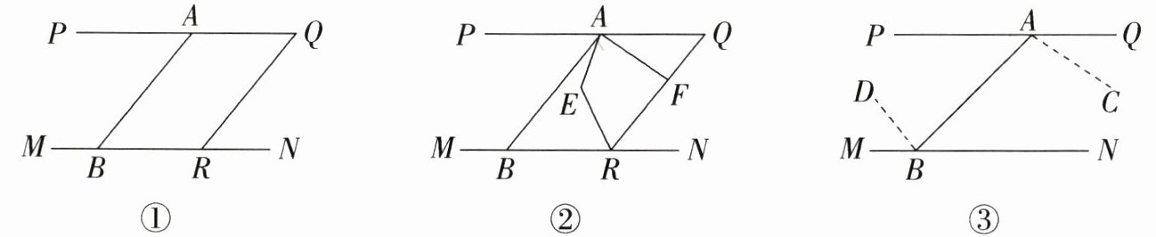(2)∠AFR + 2∠AER = 360°.理由如下:如图①,延长AE交MN于点G,延长AF交MN于点H.因为AE平分∠PAF,RE平分∠BRF,所以设∠PAE = ∠EAF = α,∠ERB = ∠ERF = β.因为PQ//MN,所以∠EGR = ∠PAE = α,所以∠AER = 180° - ∠GER = ∠EGR + ∠ERB = α + β.同理∠AFR = 180° - ∠RFH = ∠QRH + ∠AHR = ∠QRH + ∠QAF = 180° - 2β + 180° - 2α = 360° - 2(α + β).所以∠AFR + 2∠AER = 360°.