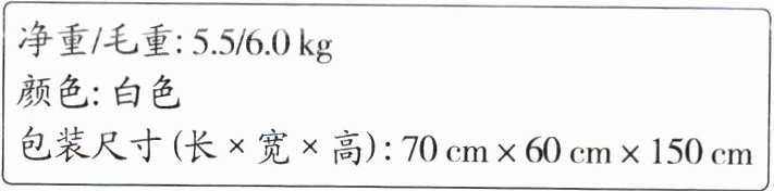 包装盒重:$6.0 - 5.5 = 0.5$(kg),体积:$70×60×150 = 630000$($\text{cm}^3$).答:包装盒重0.5kg,体积为630000$\text{cm}^3$.