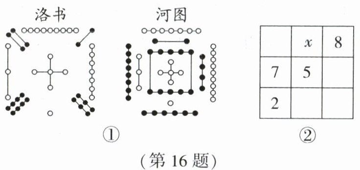 16. 新趋势数学文化如图①,河图洛书是中国古代流传下来的两幅神秘图案,被誉为“宇宙魔方”,是中华文化、阴阳五行术数之源.图②是由河图洛书得到的3×3的一个九宫格,把1~9这九个数填入方格中,使其行、列及对角线上的三个数之和都分别相等,则图②中x的值应为______.