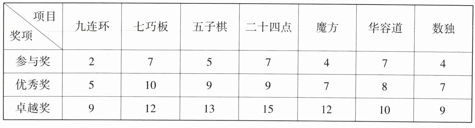 16 58 [解析]因为在所有获得卓越奖项目的前一个项目中都获得参与奖,所以当华容道和数独都获得优秀奖时,得分为$8 + 7 = 15$(分);当华容道获得参与奖、数独获得卓越奖时,得分为$7 + 9 = 16$(分),所以可推断小明在“华容道”和“数独”这两个项目的积分之和最高为16分.因为小明在“九连环”项目中没有获得卓越奖,所以小明在“九连环”项目中可能获得参与奖或优秀奖.因为在所有获得卓越奖项目的前一个项目中都获得参与奖,所以:①当七巧板获得卓越奖时,九连环获得参与奖,其他三个项目获得优秀奖,所以总积分为$2 + 12 + 9 + 9 + 7 + 16 = 55$(分);②当七巧板、二十四点获得卓越奖时,九连环、五子棋获得参与奖,所以总积分为$2 + 12 + 5 + 15 + 7 + 16 = 57$(分);③当五子棋获得卓越奖,二十四点获得优秀奖,九连环获得优秀奖时,七巧板获得参与奖,所以总积分为$5 + 7 + 13 + 9 + 7 + 16 = 57$(分);④当二十四点获得卓越奖,九连环、七巧板获得优秀奖时,五子棋获得参与奖,总积分为$5 + 10 + 5 + 15 + 7 + 16 = 58$(分).综上所述,他参加此次“数学游戏挑战赛”活动的总积分最高为58分.